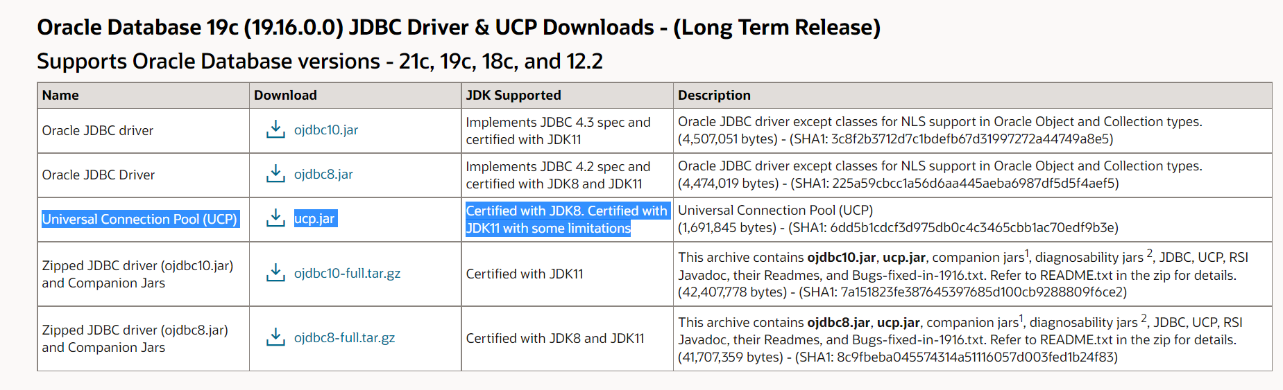 请注意,我知道通过JDK11 (包括ucp.jar)认证的网站上列出的Oracle21c驱动程序,但这些驱动程序还没有长期支持。所以只想使用Oracle 19c驱动程序。