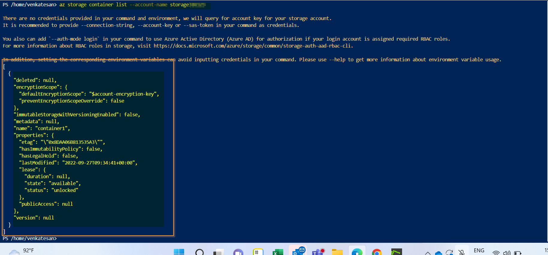 在步骤8中,当我通过运行给定的Azure CLI命令并用我的存储帐户替换来验证容器的创建时: