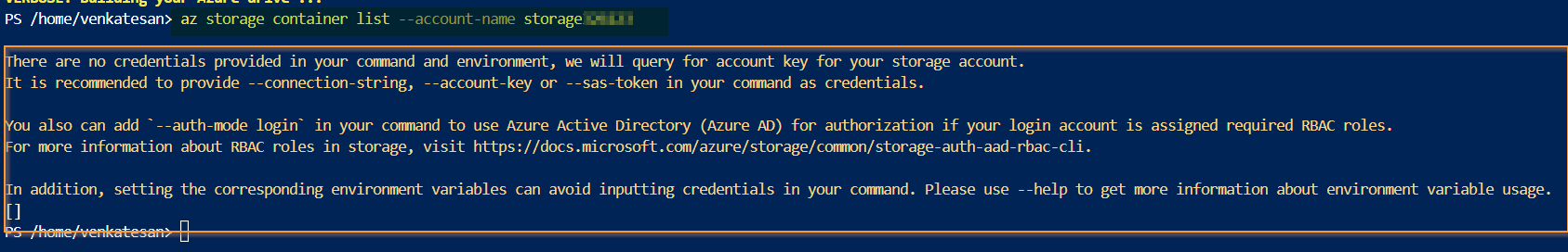 您的命令和环境中没有提供凭据,我们将查询您的存储帐户的帐户密钥。建议在命令中提供--连接-字符串、--帐户-键或-sas-令牌作为凭据。 如果您的登录帐户被分配了所需的RBAC角色,您还可以在命令中添加