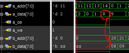 end我从A端口读取一些数据,并立即将它们写入B端口。但是,来自A端口的B端口的输入数据延迟了一个时钟。