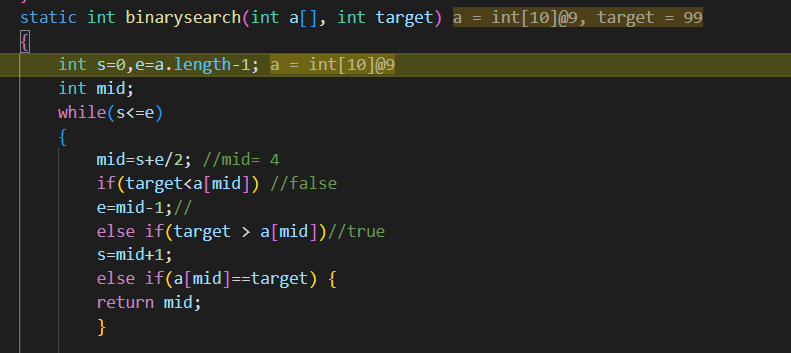 if(target<a[mid]) //false
