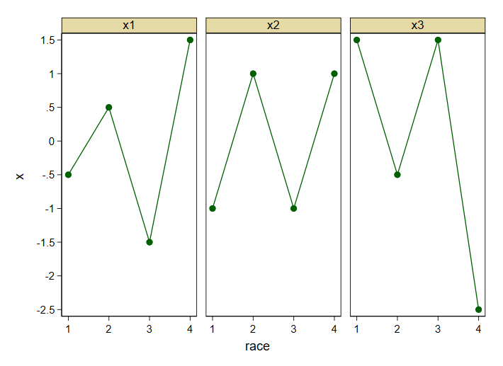 twoway connected x race, by(which, note("") row(1)) yla(-2.5(0.5)1.5, ang(h))