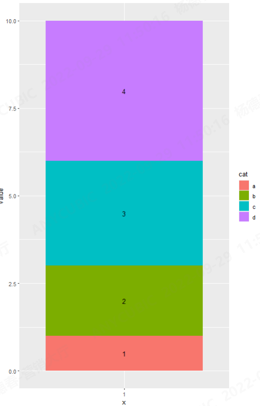 ggplot(plot_data, aes(x = "1", y = value, fill = cat)) +