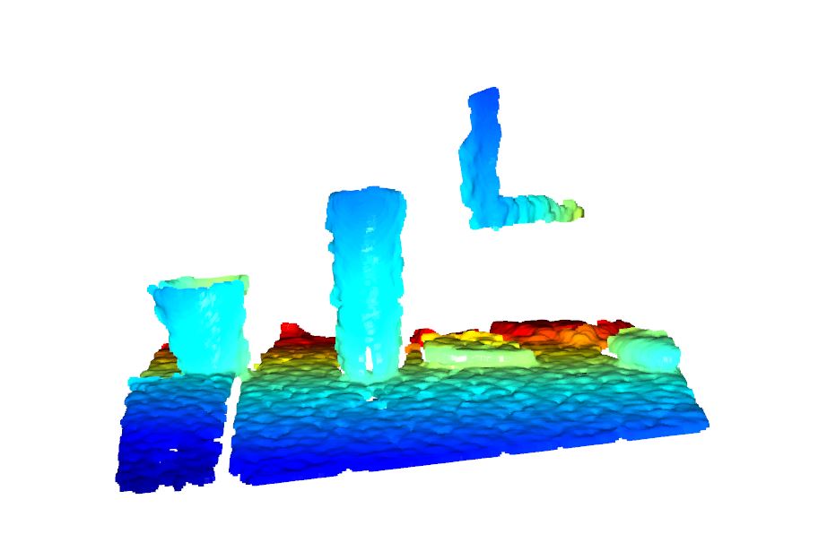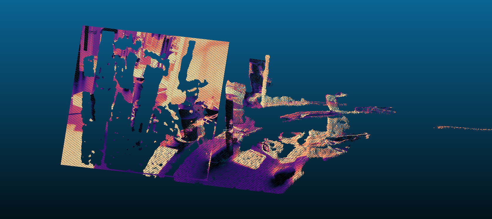 save_las("fn.laz", image[:400, :, 0].flatten(), np.c_[yv.flatten(), xv.flatten(), depth.flatten()], cmap = plt.cm.magma_r)结果就是这样。如你所见,物体从正面可见。