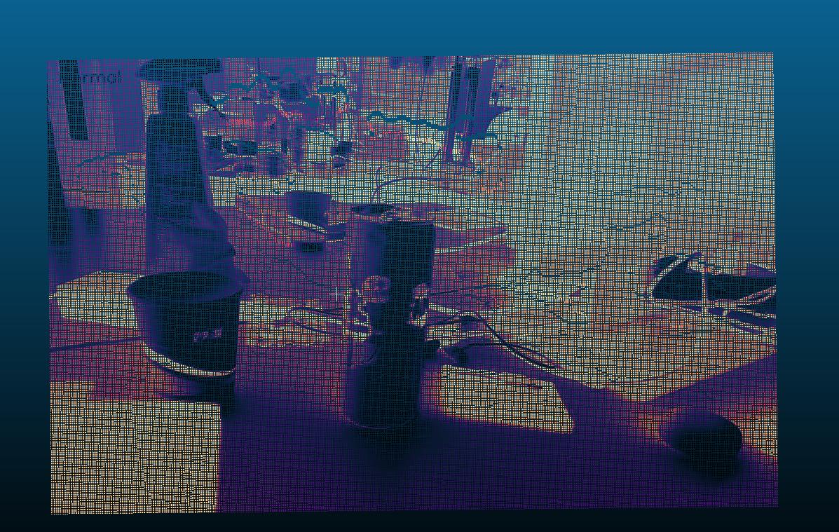 o3d.visualization.draw_geometries([pcd])然而,如果您按照提供的代码,整个场景看起来非常奇怪和不熟悉。这是因为你的深度文件包含0到几乎2.5米之间的数据。我引入了一个500或1000毫米的截断加上删除了所有的0,如另一个答案所建议的。此外,我翻转x轴(浮点(-x),而不是浮点(X)),以像你的照片。