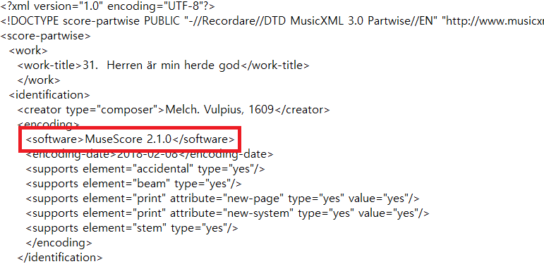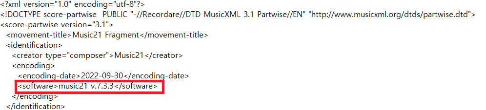 music21实际上从零开始对输出进行编码,所以这就是为什么它在<software>中列出的原因,但是如果您想要更改它:
