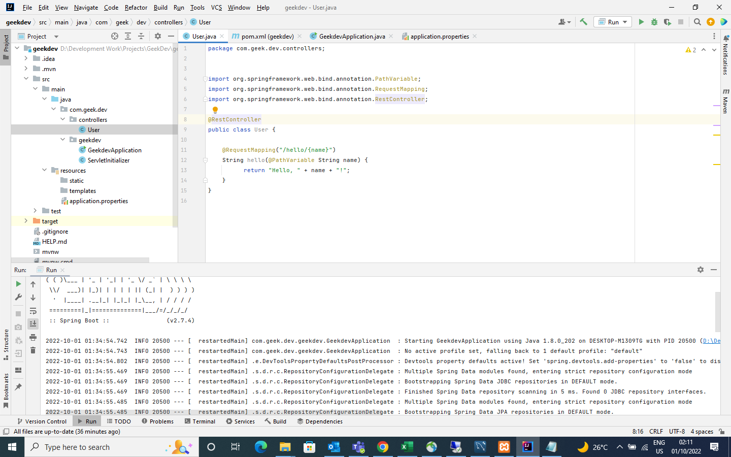 2022-10-01 01:34:58.516 INFO 20500 --- [ restartedMain] com.geek.dev.geekdev.GeekdevApplication : Started GeekdevApplication in 4.233 seconds (JVM running for 4.911)