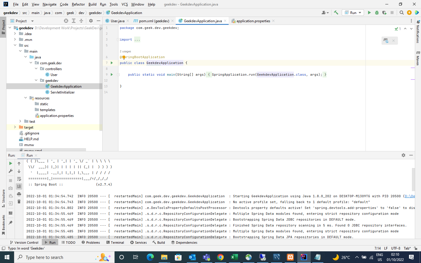 2022-10-01 01:34:54.742 INFO 20500 --- [ restartedMain] com.geek.dev.geekdev.GeekdevApplication : Starting GeekdevApplication using Java 1.8.0_202 on DESKTOP-M1309TG with PID 20500 (D:\Development Work\Projects\GeekDev\geekdev\target\classes started by Avrio01 in D:\Development Work\Projects\GeekDev\geekdev)