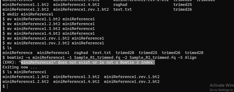 我使用的是领结2软件,它对基因组序列进行比对。我的所有索引都在一个目录miniReference1中。