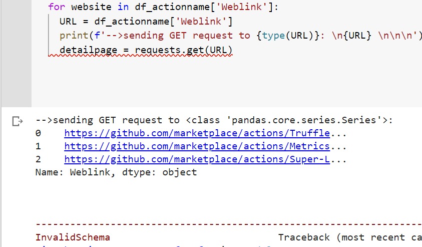 在get_adapter InvalidSchema(f“未为{url!r}找到连接适配器”)中,requests.exceptions.InvalidSchema:没有为'0 https://github.com/marketplace/actions/Truffle...\n1 https://github.com/marketplace/actions/Metrics...\n2 https://github.com/marketplace/actions/Super-L...\n3 https://github.com/marketplace/actions/Swift-Doc\nName:Weblink,dtype: object‘找到连接适配器
