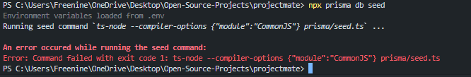 Error: Command failed with exit code 1: ts-node --compiler-options {"module":"CommonJS"} prisma/seed.ts
