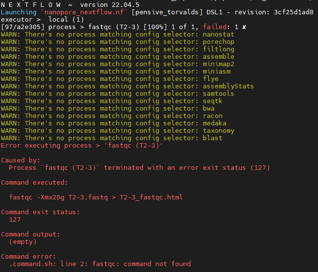 嗨,请在下面找到一个nf脚本和一个配置文件。我已经在两台电脑上运行过了。这两台计算机都安装了nextflow (v22.04.5)和docker。但是,一台计算机显示错误消息。请看所附的截图。我检查了日志文件,它只有一个“命令未找到”。我想知道你能不能指出这台电脑缺了什么。谢谢。