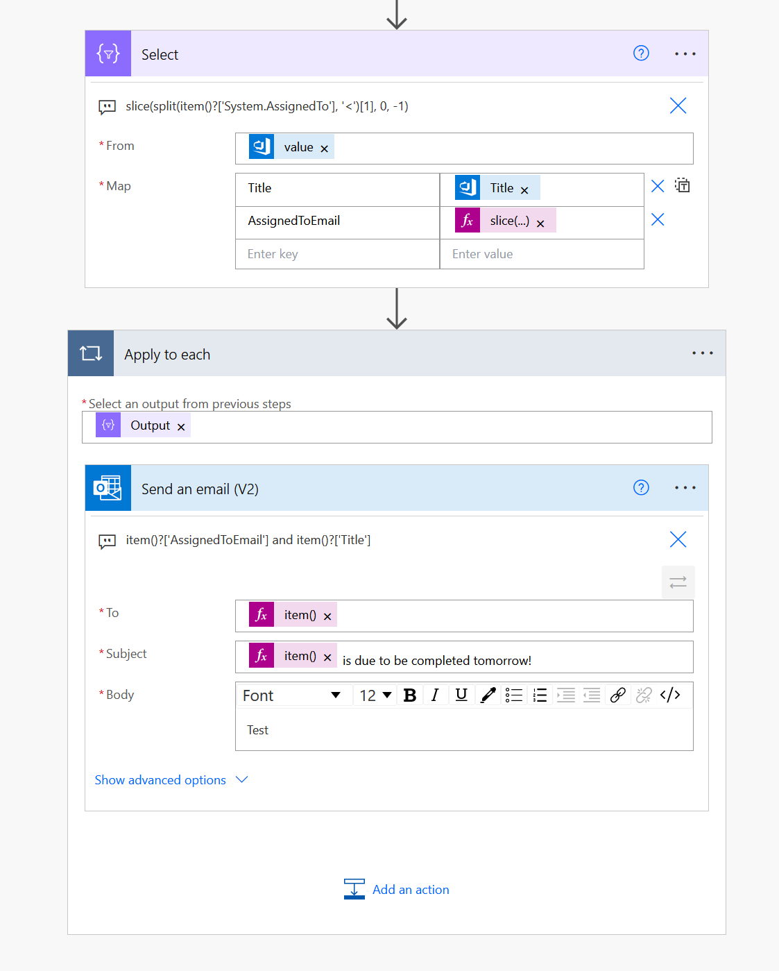slice(split(item()?['System.AssignedTo'], '<')[1], 0, -1)在此之后,您可以循环遍历Select.Per工作项的项,提醒将发送给AssignedTo用户。