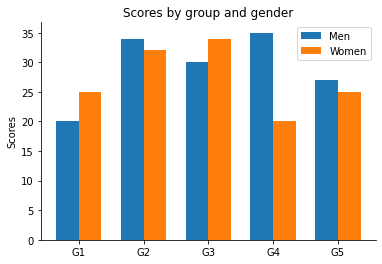 ax.set_title('Scores by group and gender')