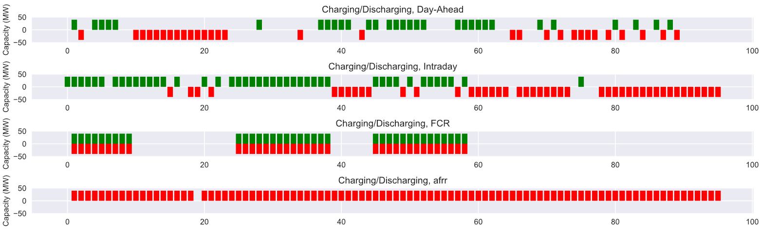 您的代码中没有多少解释性注释,但我认为您有4个市场: IntraDay、Day、FCR、AFRR,每个市场都有相应的价格和成本。因此,你实际上是在建立一个分销系统的模型,如果有一些价格差异来生产你所展示的产品,这将是完全合法的。如果FCR成本低,价格高(在FCR市场和其他市场),您可以大量购买,并在相同的市场或其他市场出售,这似乎正在发生。