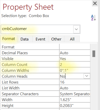 以下是制作组合框的一些指导,组合框用于显示用户友好的值,而不是ID。例如,我们不显示原始的CustomerID,而是显示Customer_name,但是组合框中的值是CustomerID。未绑定组合框的值是与用户选择的用户友好的CustomerID对应的Customer_Name。无论组合框是绑定的还是未绑定的,您都以相同的方式设置它们。从某个表或查询中选择一组列,然后声明要显示多少列及其宽度。若要隐藏列,请将其宽度设置为0。列的顺序决定数字的顺序。我绑定到表,这两个表都是ID,然后是用户友好的描述,所以列宽度是0,1。