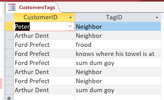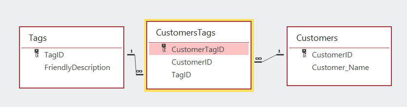 一切都从规范化的表结构开始。不幸的是,您从相对困难的开始--多到多关系。每个客户都可以有多个标签,这是一对多的关系,但是除非客户有相同的标签,否则比较客户就没有什么意义了,这意味着每个标签也可以有很多客户。例如,使用相应的主键和外键创建表,并通过点击色带并选择relationships工具告诉access关系: