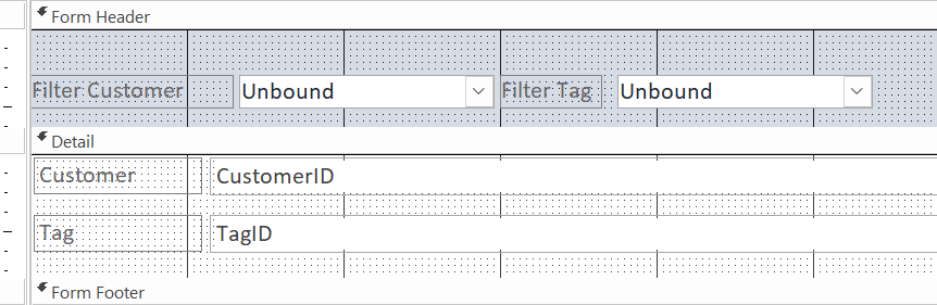 我继续使表单更漂亮,并在标题中添加两个未绑定的组合框来过滤表单。您也可以使用列表框或复选框等来完成此操作。例如,一个多选择列表框,以便您可以选择多个标签。在所有情况下,只需设置窗体筛选器即可。