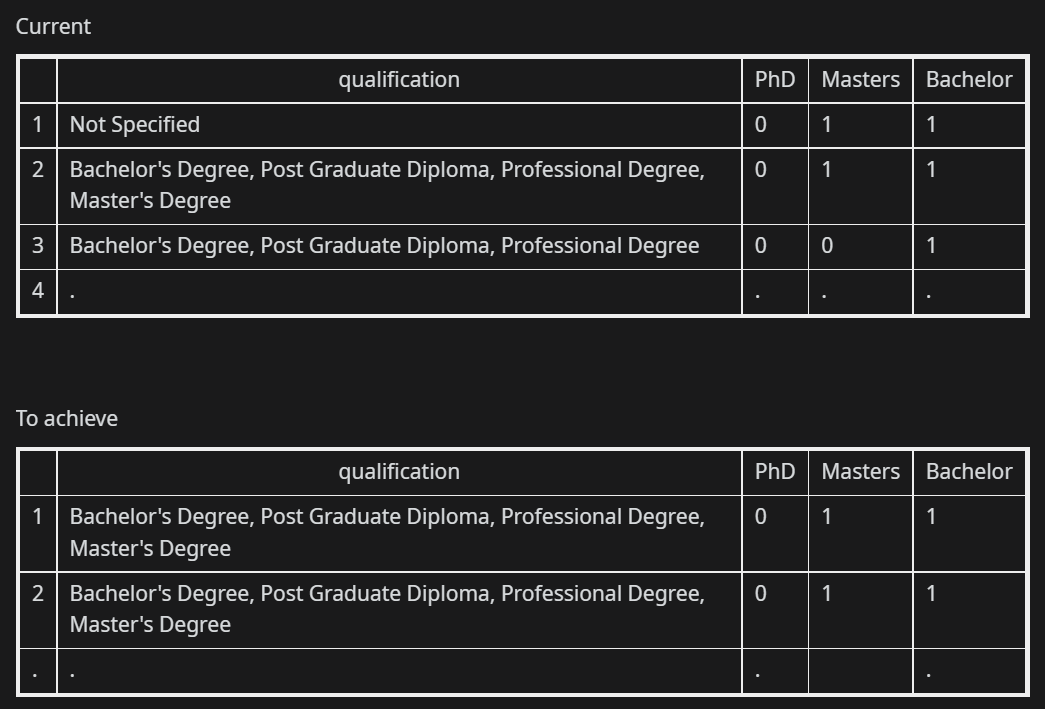 我试图执行数据清理,我遇到了困难,我遇到了解决方案,我想迭代熊猫的数据,以便我可以更新这些行下的字符串“未指定”的资格栏。