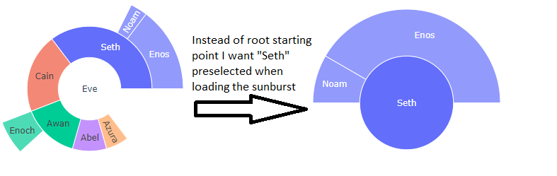 我认为您可以通过level属性在go.Sunburst中而不是在px.sunburst中实现这一点,您可以设置预选哪个级别。现在,如果您单击预选图的中心,它将带您到原始图。