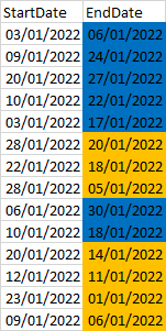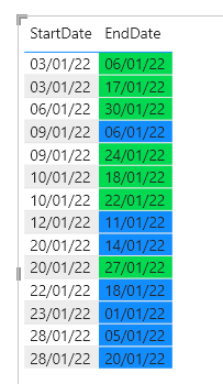 IF StartDate > EndDate THEN Blue else green预期产出