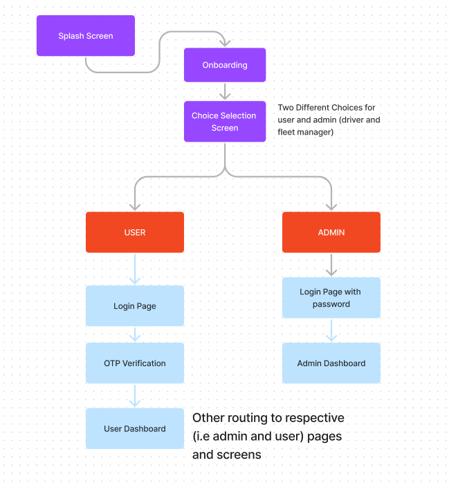 目前,我们正在进行一个项目(车队管理系统),我们有两个用户角色,管理(车队经理)和用户(车队驱动)。因此,我们希望为管理和用户创建单独的仪表板和登录屏幕。那么,实现这一目标的正确途径应该是什么呢?我已经附上了基本的用户流程。