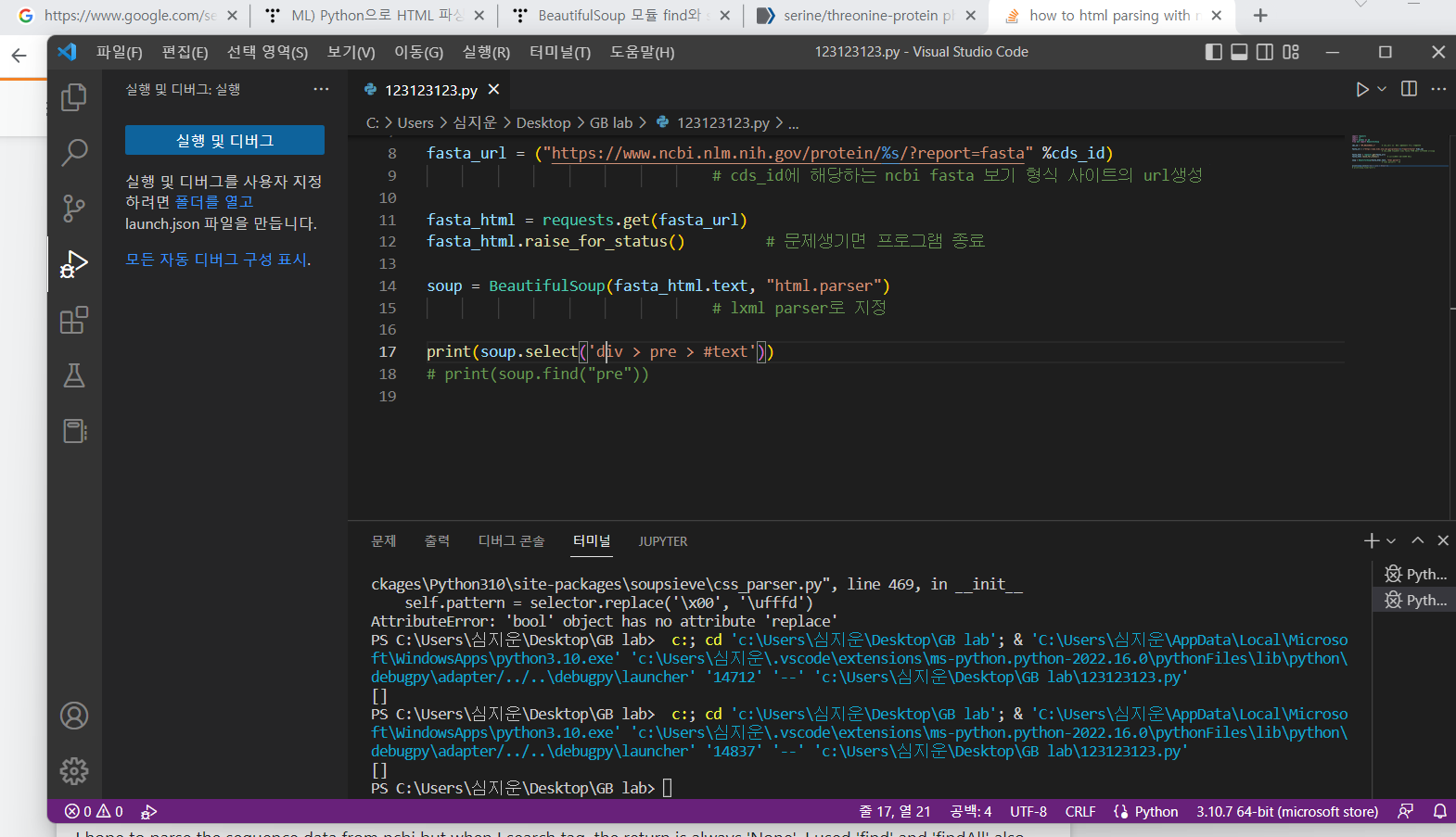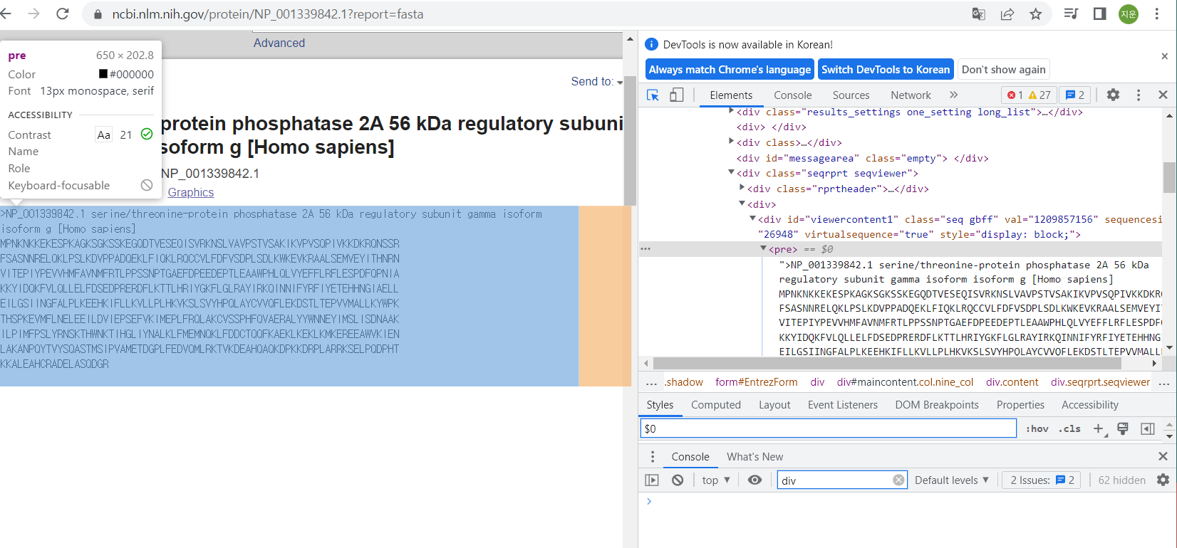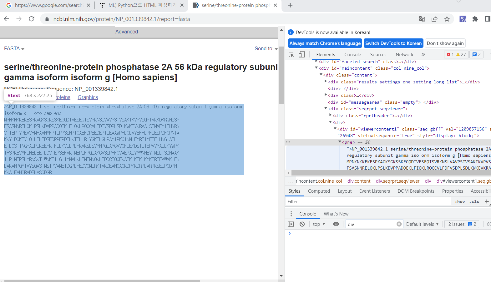 print(soup.select('div > pre > #text'))我希望解析来自ncbi的序列数据,但是当我搜索标记<pre>时,返回的总是'None‘。我也使用了“find”和“findAll”,但结果是一样的。