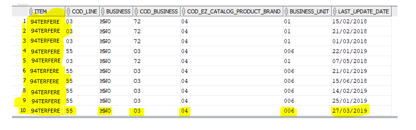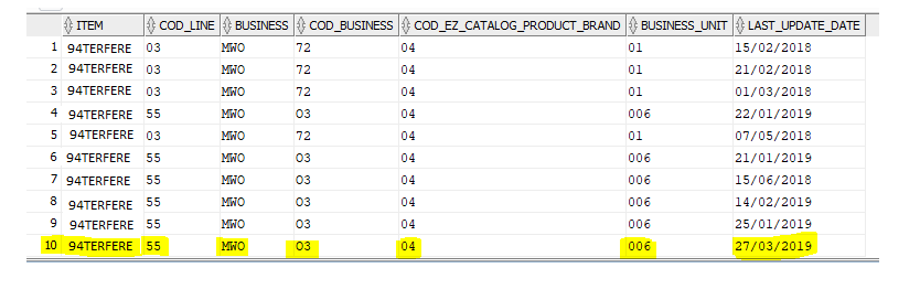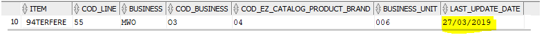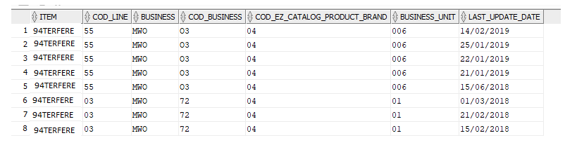 SELECT item, cod_line, business, cod_business, cod_ez_catalog_product_brand, business_unit, last_update_date