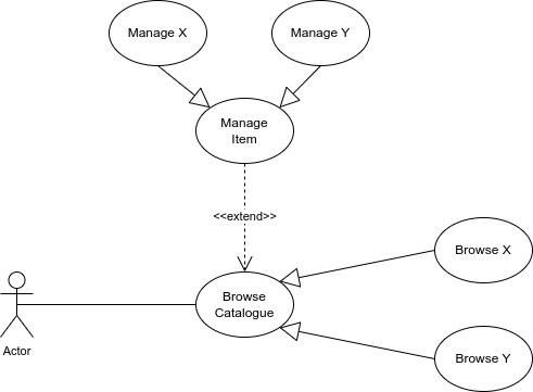P.S --不相关的想法__:图表可能会造成歧义,因为它一方面暗示浏览是根据项目类型(浏览X和浏览Y)进行的,但同时也表明任何浏览都可以通过管理任何类型的项目(管理X、管理Y)来扩展。这可能是创建用例时考虑到某些类设计而不是以用户目标为中心的另一个症状。