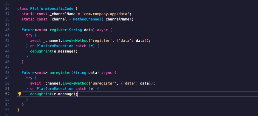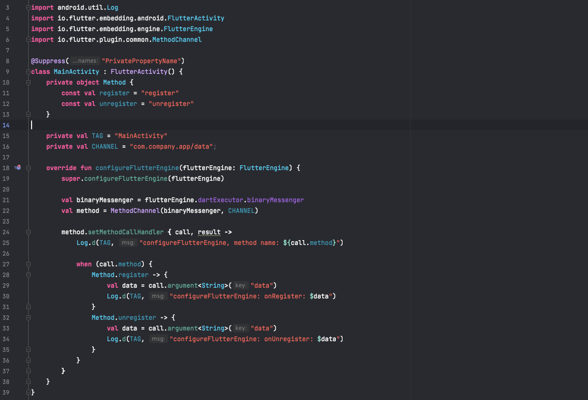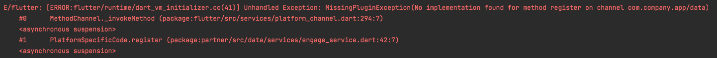 我有这个platform-specific代码,它使用MethodChannel,它总是抛出一个MissingPluginException,尽管实现已经存在于Android主活动文件中!
