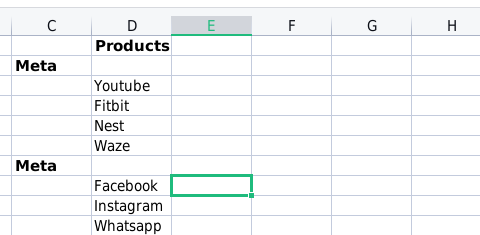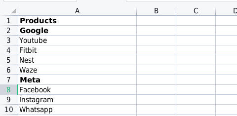 我是熊猫新手,我有一个从excel文件中读取的Dataframe,比如下面的屏幕截图,其中Products是标题,Google和Meta是组(索引)。