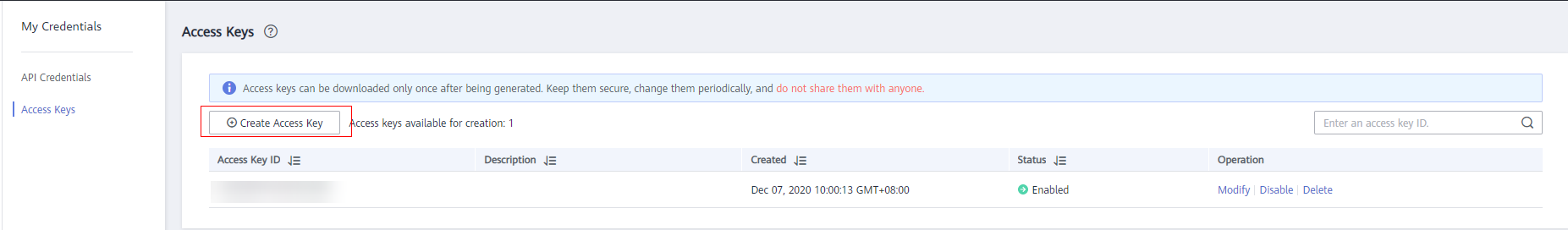 • Keep your access keys secure and change them periodically for security purposes. To change an access key, delete it and create a new one. Source - https://support.huaweicloud.com/intl/en-us/usermanual-ca/ca_01_0003.html