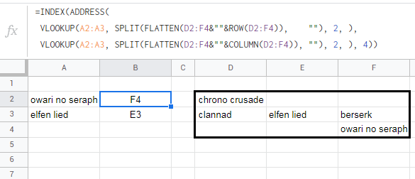 , 0)基本上,如果所有单元格相等于搜索项,则将搜索范围内的所有单元格转换为地址。然后使二维范围变平,并滤除非空值。