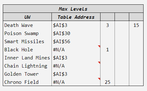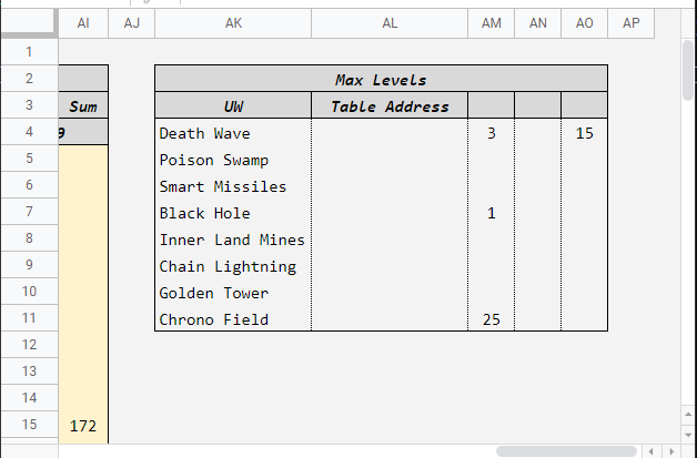 =CELL("address",LOOKUP($AK4, $C$2:$AI$78))这将检索错误的值。对于AL4 (查找值Death Wave),LOOKUP($AK4, $C$2:$AI$78)应该检索单元格C2,但是它会找到AI2。