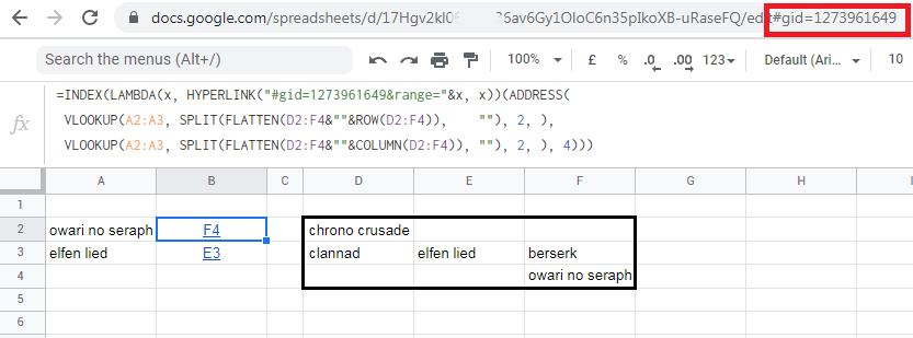 =INDEX(LAMBDA(x, HYPERLINK("#gid=1273961649&range="&x, x))(ADDRESS(