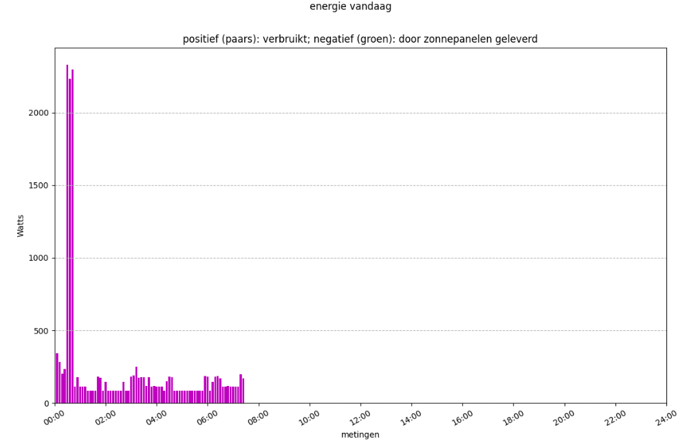 我有一个P1meter,它从我的电度表/气压计中读取值。因此,我得到一个时间戳和一个正负电值,这取决于我是使用电力,还是我的太阳能电池板产生的电能比我使用的更多。(实际上,我得到了很多价值观,但它们现在并不相关)。所有数据都存储在一个sqlite3 DB中。我使用myquery="select timestamp tmstmp, verbruiknuw from v_p1data where substr(timestamp,1,10) == date()"这样的查询从数据库中收集数据