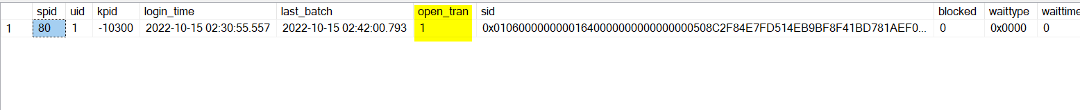 SELECT * FROM sys.dm_exec_sessions where open_transaction_count=1;SELECT * FROM sys.sysprocesses WHERE open_tran = 1查询: