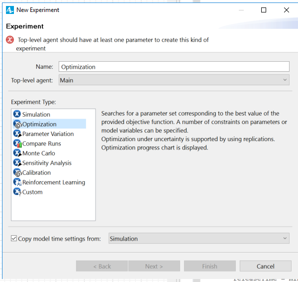 转到File->New->Experiment并从列表中选择优化。在右边,你需要定义你的目标函数和约束。本主题将在这里文档中解释AnyLogic。您应该为每个资源都有一个参数。例如,在优化目标中,您需要说最小化noResourcePoolProcess1。例如,利用率低于85%是一个很好的限制。否则,最小化将不会关心您的系统是否节流。