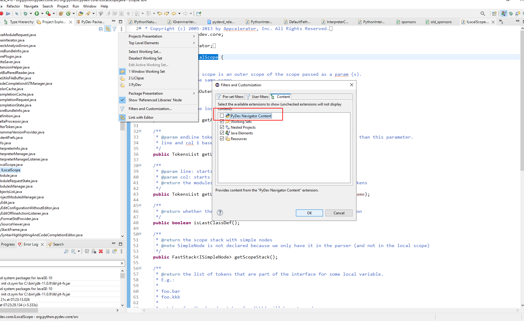 这是一些回归en Eclipse本身(因为多年来在PyDev中没有任何变化,但是当PyDev Navigator Content在Project Explorer中启用时,Eclipse开始出现错误--或者他们可能修复了PyDev所依赖的一些bug )。