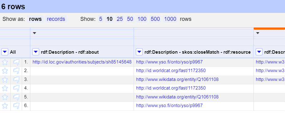 这是一张我的OpenRefine项目的照片。我需要将skos的所有实例:CloseMacth从一个RDF/XML列中提取到一个单独的OpenRefine列中。
