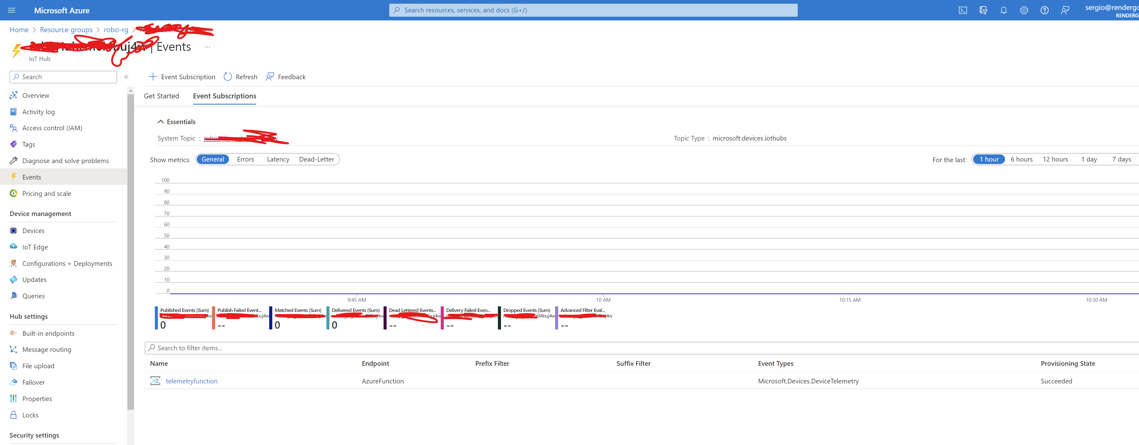 我在代码中注释掉了遥测消息,因此只将记录的属性更改发送到IoT集线器,但是属性更改不会显示事件: