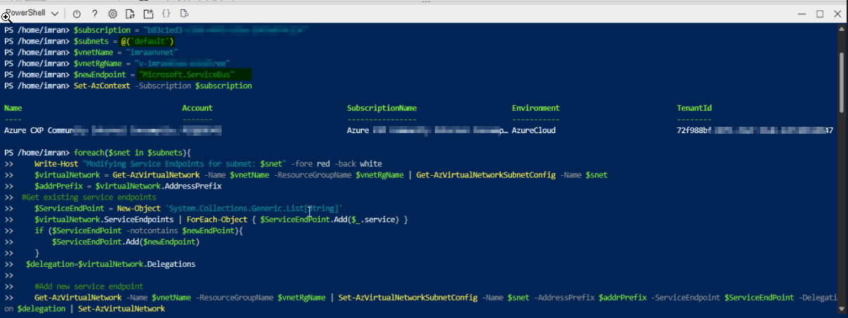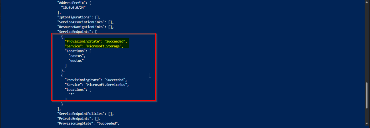 我尝试使用下面的powershell脚本将另一个服务端点Microsoft.ServiceBus添加到同一个具有默认子网的虚拟网络中。