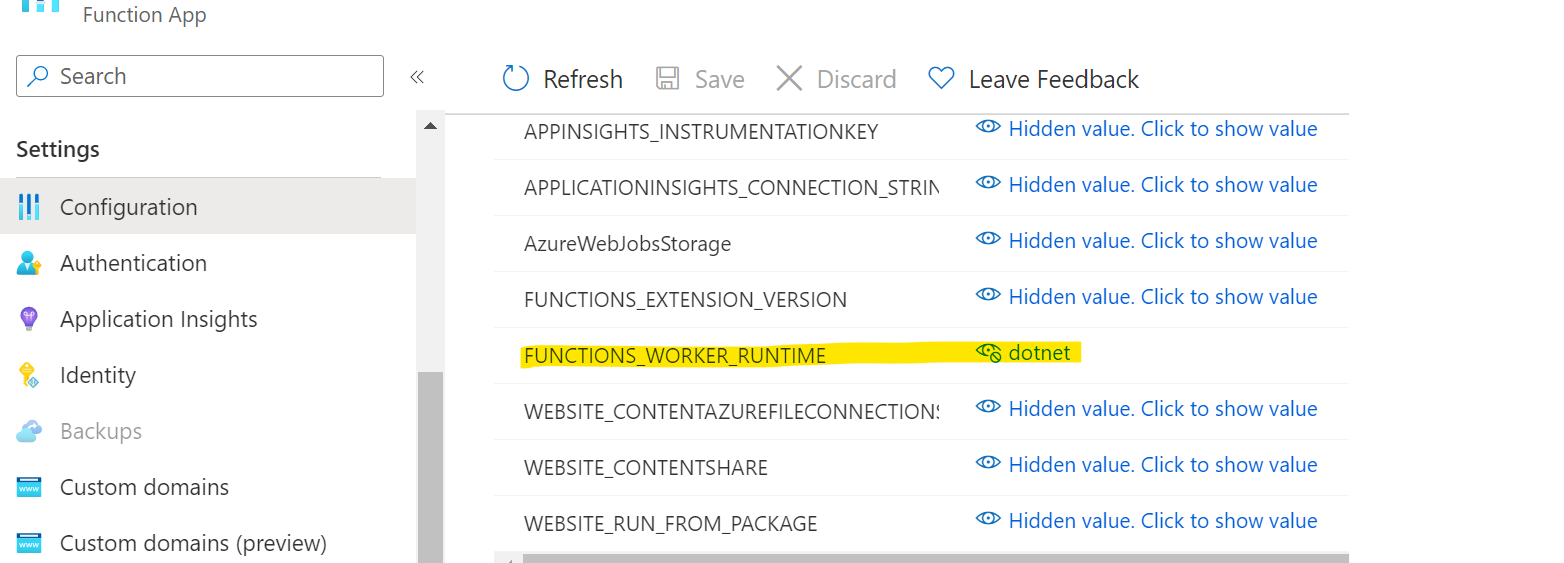 答案在于配置变量FUNCTIONS_WORKER_RUNTIME的值。