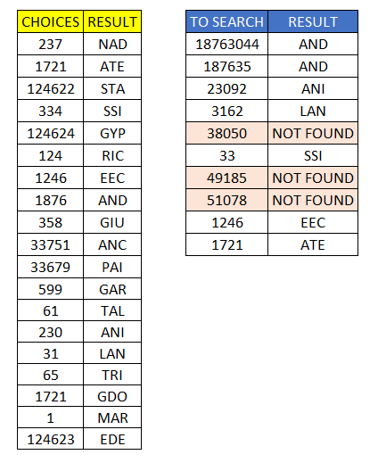 这是我当前的代码,它几乎为不同的值打印正确的输出,但是对于在to_search中没有任何相似性的值,我想在output Not Found中显示,但是现在我得到了一些其他的输出。