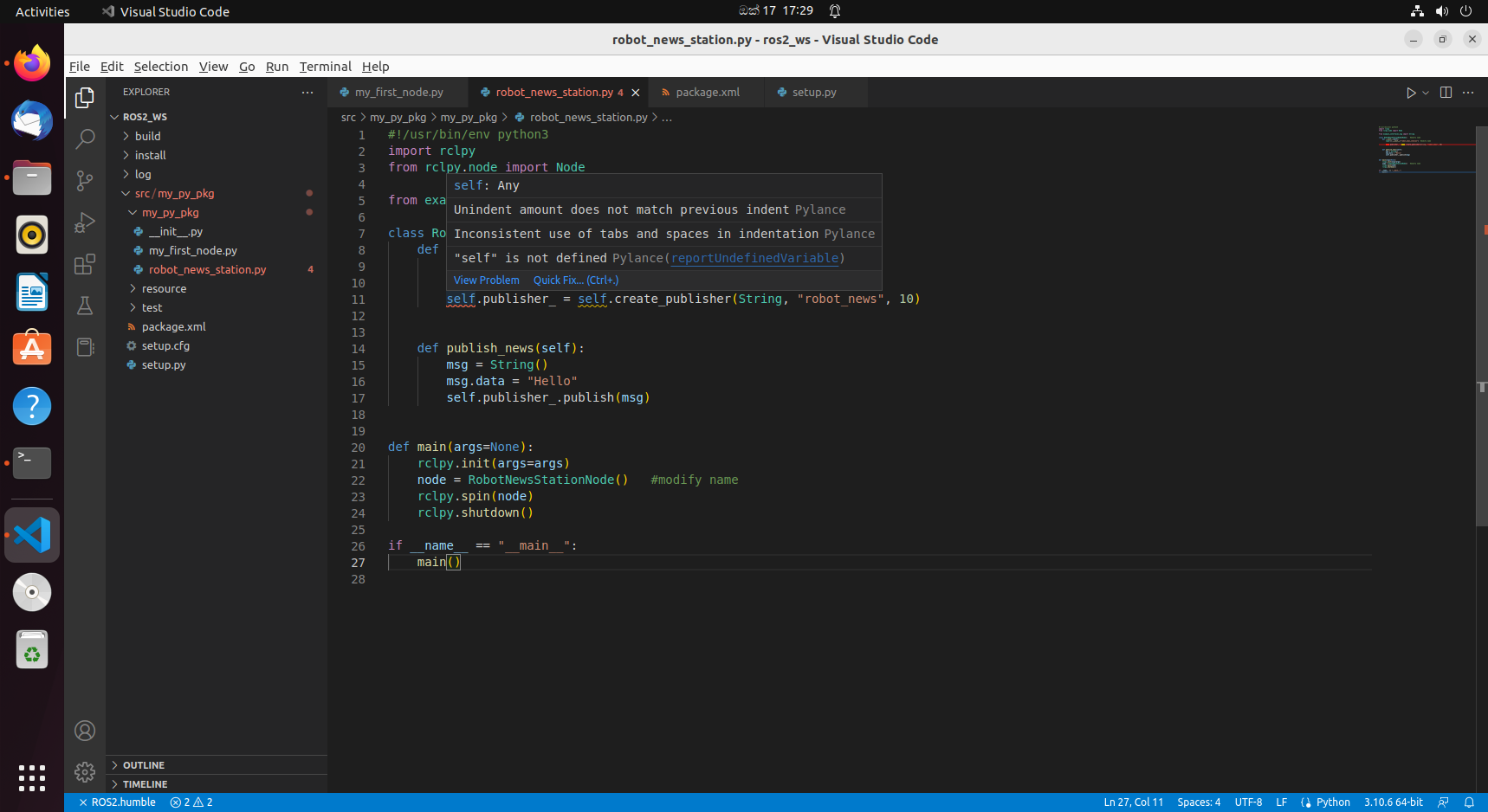 我正在学习如何理解如何用ROS2编写publisher。这是我正在创建的一个例子。代码似乎没有任何错误,但在vscode中,self单词以红色划线,当我将鼠标悬停时,它显示"self“未定义。如何在vscode中解决这个问题?