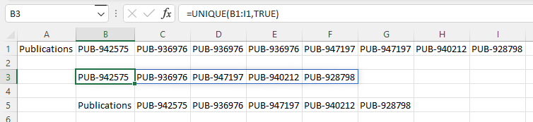 =UNIQUE(B1:I1,TRUE)[by_col]参数TRUE指示按列返回唯一参数。如果您想添加单词Publication,那么可以尝试使用HSTACK()。=HSTACK( UNIQUE(B1:I1,1)),A1)