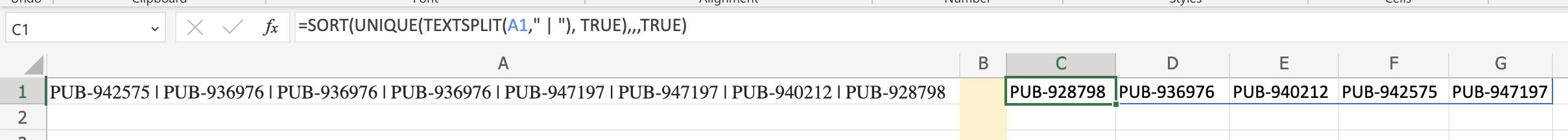 =SORT(UNIQUE(TEXTSPLIT(A1," | "), TRUE),,,TRUE)以下是返回1x5数组的列格式输出: