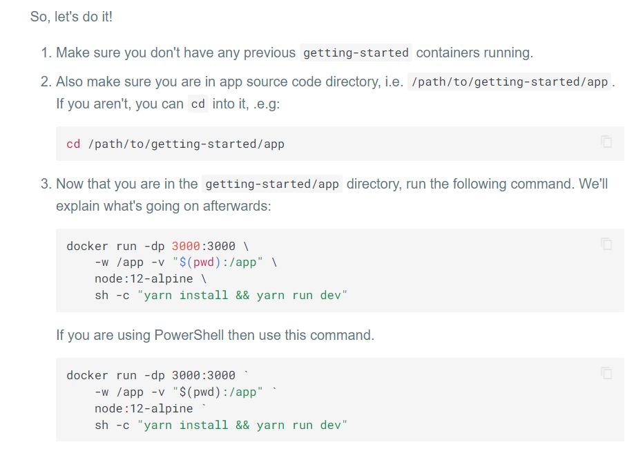 docker run -dp 3000:3000 ` -w /app -v "$(pwd):/app" ` node:12-alpine ` sh -c "yarn install && yarn run dev" - docker:守护进程的错误响应:工作目录C:/Program/Git/app无效,它需要是一个绝对路径。参见“docker run --help”。(此错误是在切换到我在PC上手动搜索的目录后发生的)