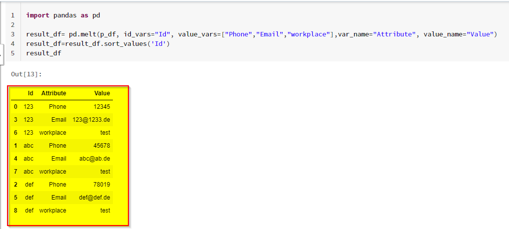 result_df= pd.melt(p_df, id_vars="Id", value_vars=["Phone","Email","workplace"],var_name="Attribute", value_name="Value")