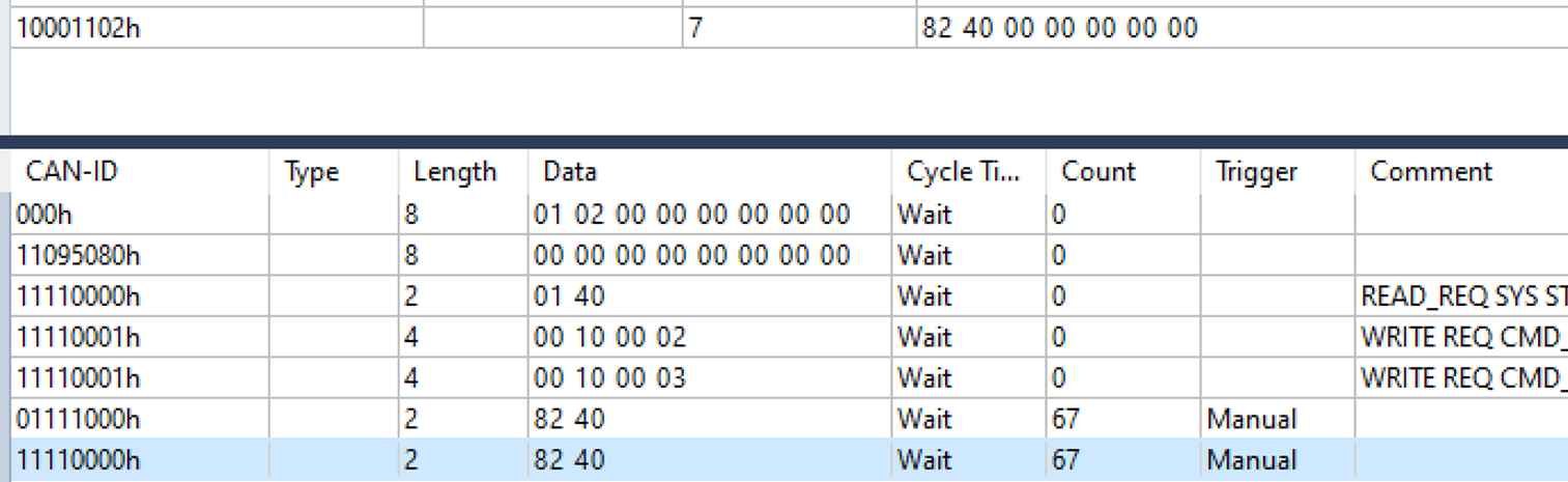 这是高亮显示的发送和顶部显示的响应的PCAN图像。